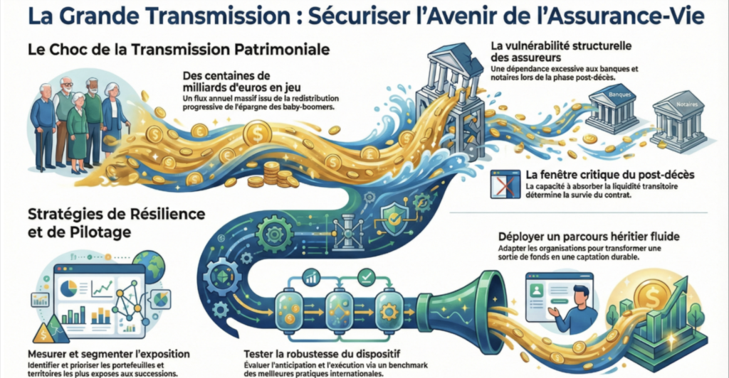 1. La Grande Transmission correspond à une redistribution progressive et accélérée de l’épargne des baby-boomers, concentrant plusieurs centaines de milliards d’euros par an, avec un rôle structurant de l’assurance-vie dans les flux successoraux.