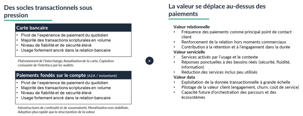 La carte bancaire demeure le pivot des usages de paiement. En France, elle représente 62 % des paiements scripturaux en nombre d’opérations³. Elle reste un socle de continuité, de confiance et de qualité de service perçue. Pour autant, son rôle économique s’est affaibli : la carte ne crée plus la valeur par la transaction elle-même. Sa contribution dépend désormais des services, protections et usages auxquels elle est adossée, ainsi que de la capacité de la banque à en rendre la valeur lisible et activable au bon moment.